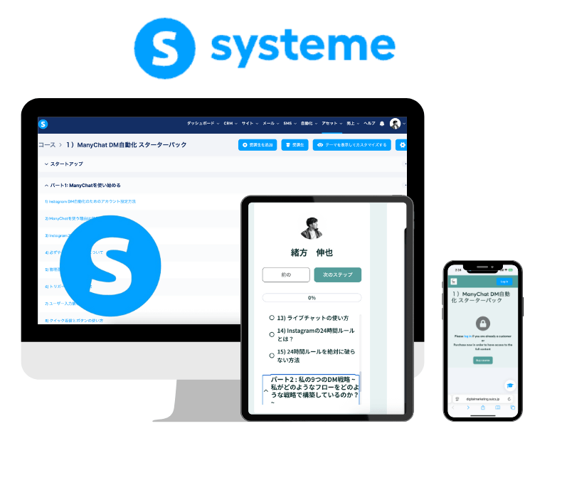 ゼロから学んで実践できるように全てのコースを画面収録をして解説。全てのコースを視聴すると自分の手でオンライン商品のセールスまで一貫した仕組み化が構築されます。